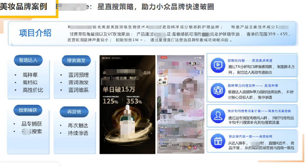 美妆化妆品源自北美是美国顶级生物技术打造的纯净成分敏感肌护理品牌;明星产品主要技术成分100%甘蔗萃取角鲨烷以及VC玫瑰果油; 产品通过EWG认证:是敏感肌可用的贵妇抗老护肤精华油, 客单价范围399-459运营初期品牌声量较小; 初始粉丝1W+, 通过星搜直打法塑造品牌形象成功突破冷启 。